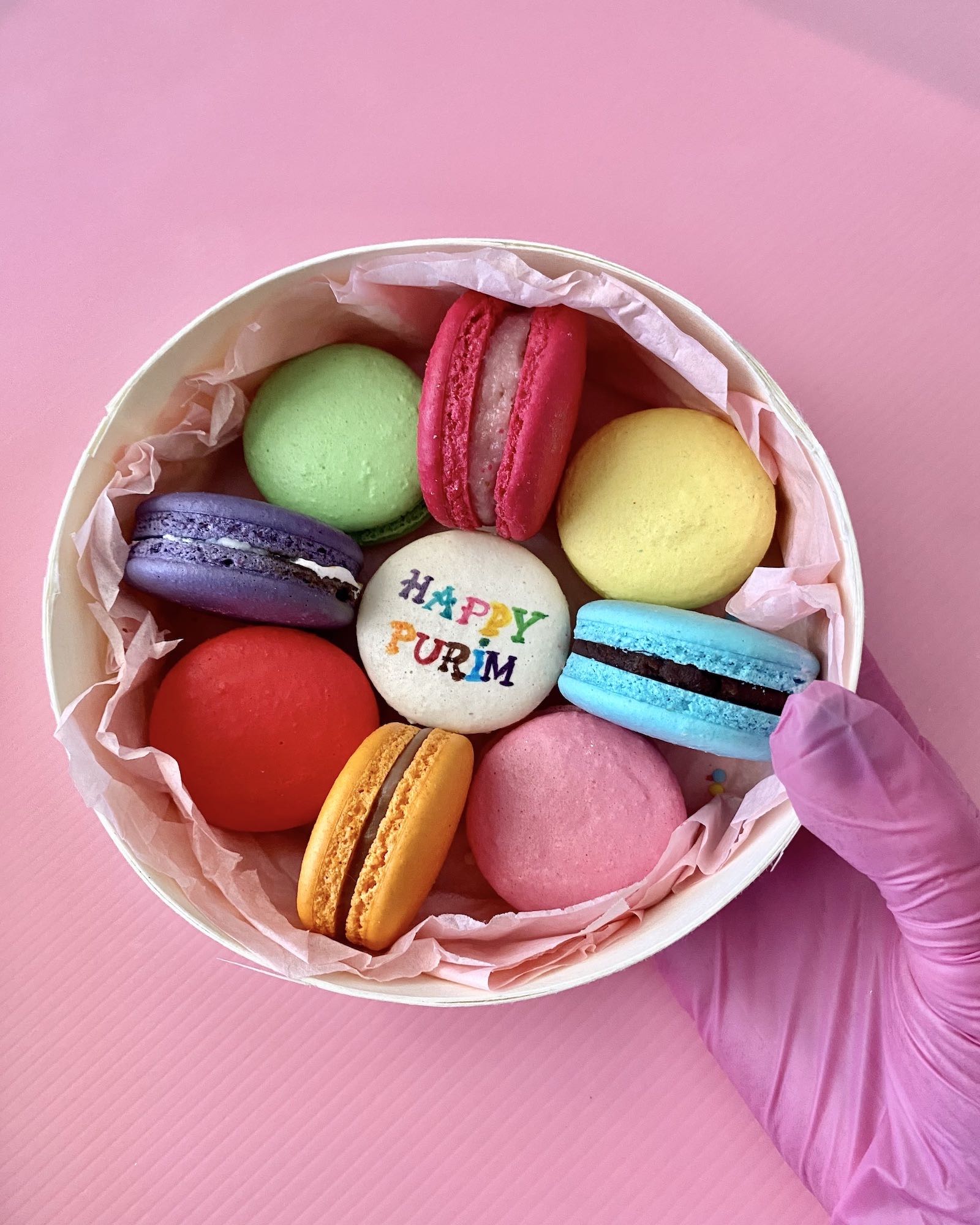 A box containing 9 macarons, including 8 colored ones and 1 personalized macaron with “Happy Purim” written on it. You can, of course, choose the flavors you prefer. Perfect for treating yourself or spoiling your loved ones!